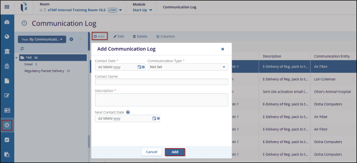 - Click the Add button displayed on the top menu bar, this will open the Add Communication Log window.