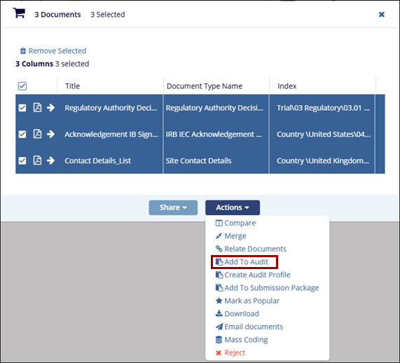 Administrator, Manager, and Editor users can add documents to the cart from the grid and include them in an existing audit by using the Add to Audit option.