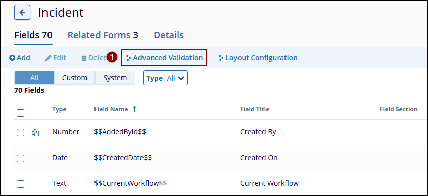 - On the Fields tab, select Advanced Validation from the top menu bar.