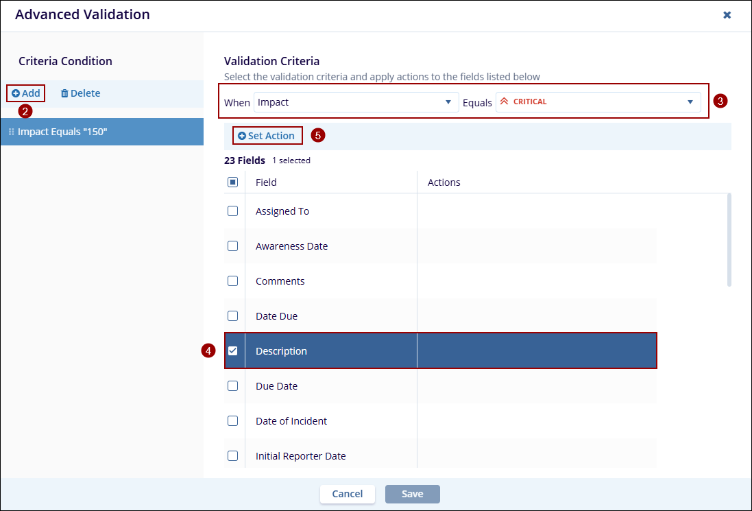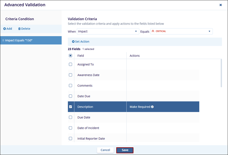 - This means that when a user creates a record, i.e., Incident, CAPA, or Action Item, etc., where this validation is applied and selects Critical as the Impact, they must provide a value in the Description field before proceeding, i.e., the Description field becomes mandatory.