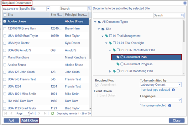 - On the right pane select the documents to be submitted by the selected Site and fill in the required fields.