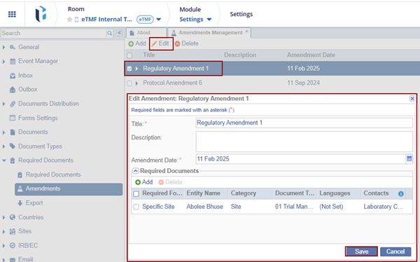 The Edit Amendment window is displayed. Make the required changes and click Save.