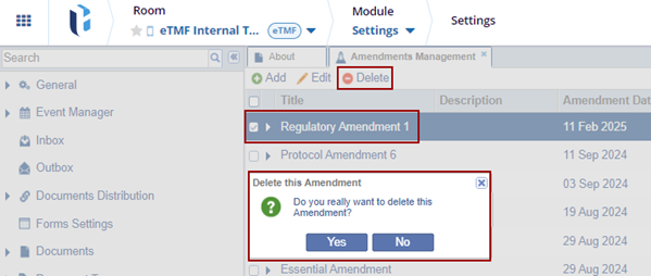 The Delete this Amendment dialog box is displayed. Click Yes if the user wants to delete the amendment.