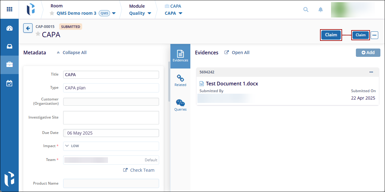 - The ‘Claim’ button appears when there are multiple authority types in the workflow stage, and any one of the authorities should manually claim the record.