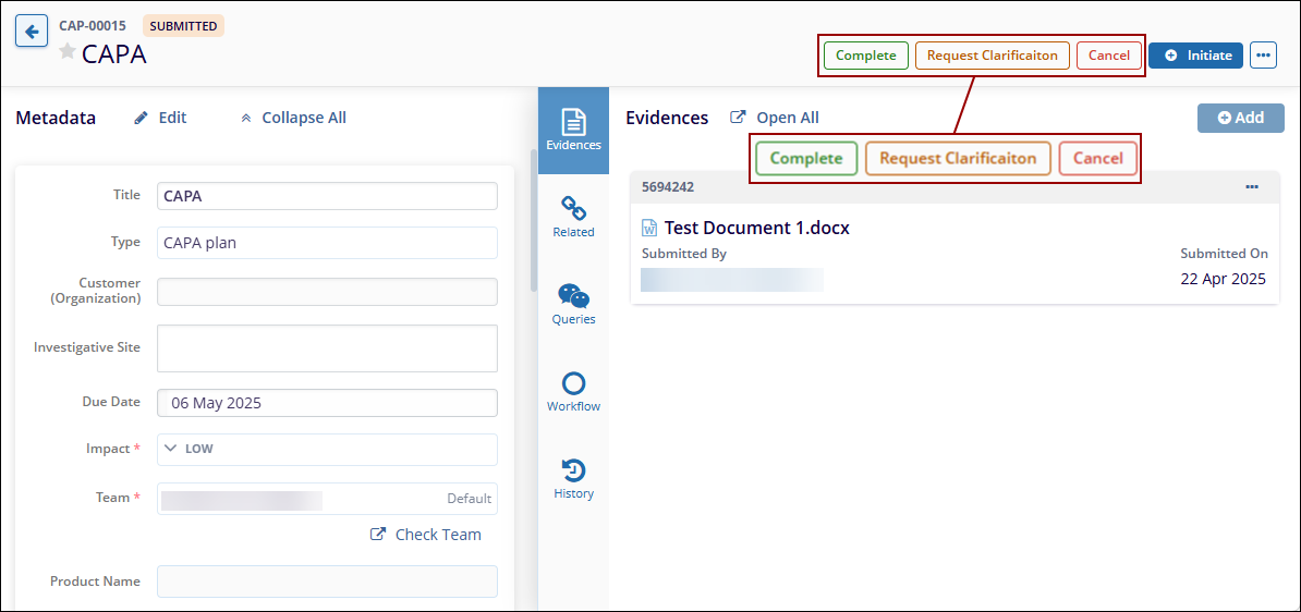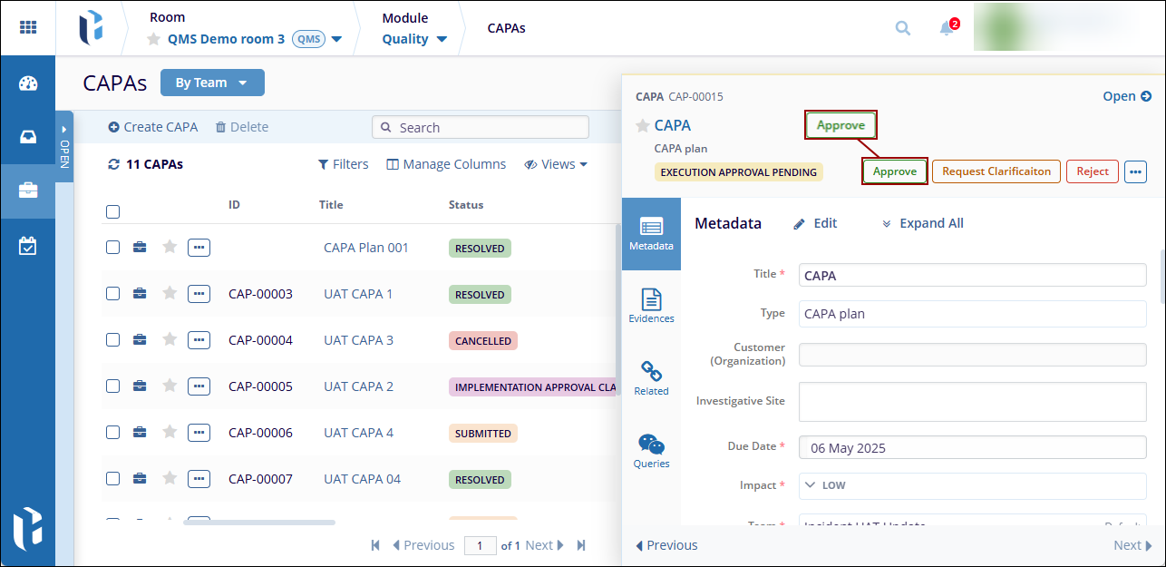 When a CAPA record enters the approval workflow, the designated authorities are responsible for advancing the record through each stage until it reaches the final stage. At the final stage, a user (typically an Approver) reviews and approves the record, thereby resolving it.