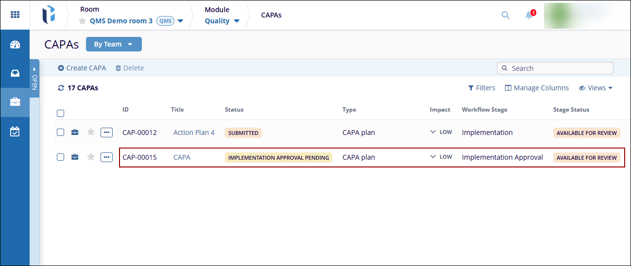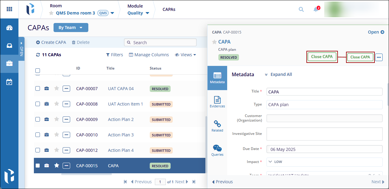 - On the CAPA records page, click on the Close CAPA button above the Quick View