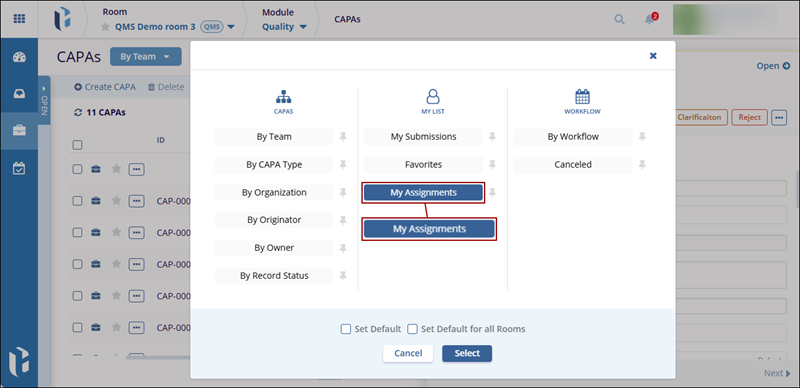 - Additionally, users can access the CAPA record assigned to them by setting the My Assignments view from the dropdown at the top.