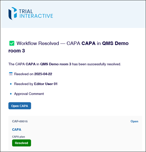 - As the assigned authority in the last stage, access the CAPA record through the email