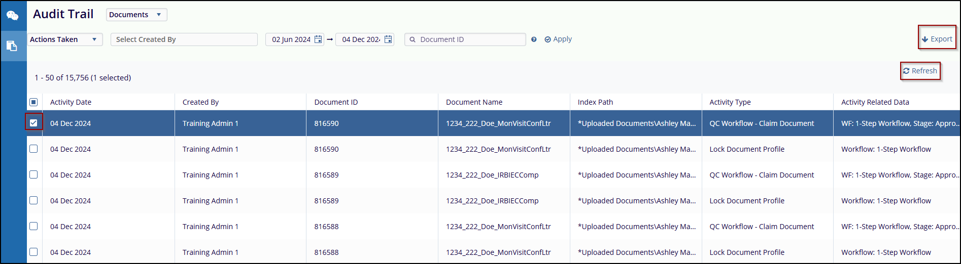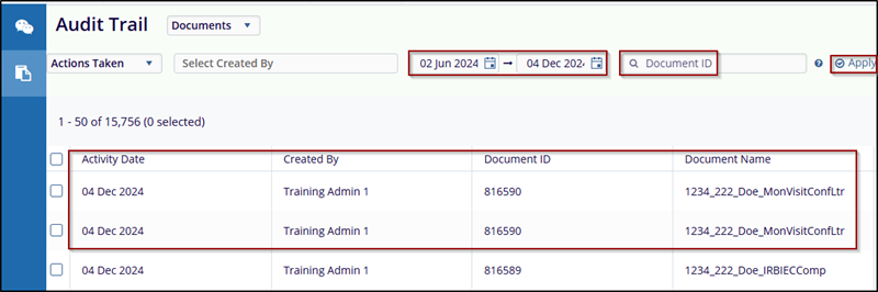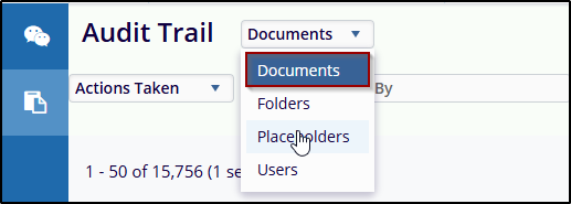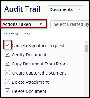 - Select an option from the Actions Taken dropdown menu to filter the audit trail