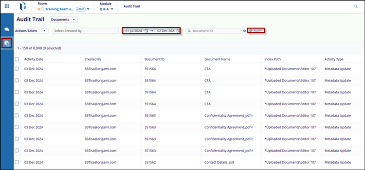 Note: By default, the audit trails grid pane is empty, and the documents are displayed only after entering and applying certain parameters and criteria.