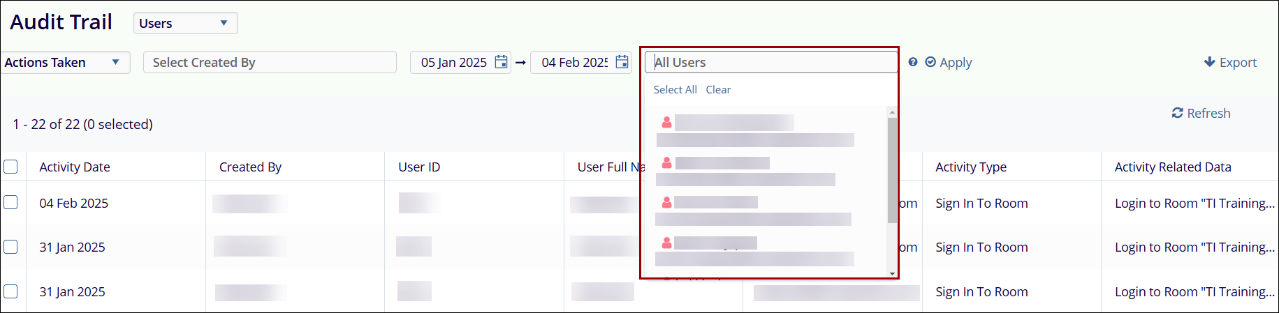 - All Users: The All Users filed allows users to retrieve audit trail for