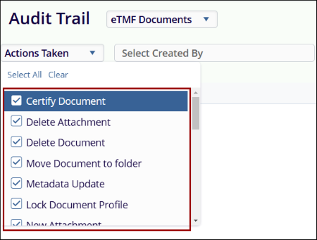 Actions Taken: This dropdown displays a list of actions to be selected from the dropdown menu for filtering the audit trail as per the selected parameter. The Actions Taken dropdown populates and displays actions depending upon the parameter selected. Users can either select all actions or select specific actions by clicking on their respective checkboxes.
