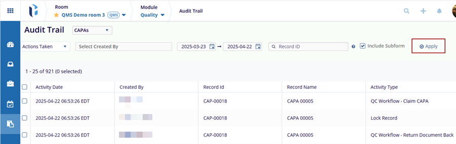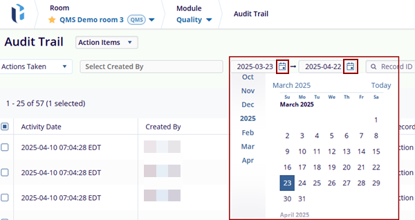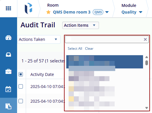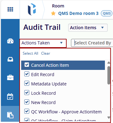 dropdown menu for filtering the audit trail as per the selected parameter. The Actions Taken