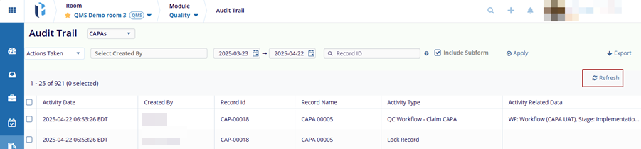 Refresh: The Refresh button is visible and accessible when the audit trail results