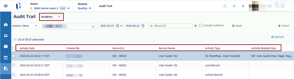 The audit trail information will be presented as shown below, based on the selected parameters: