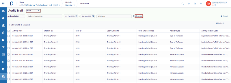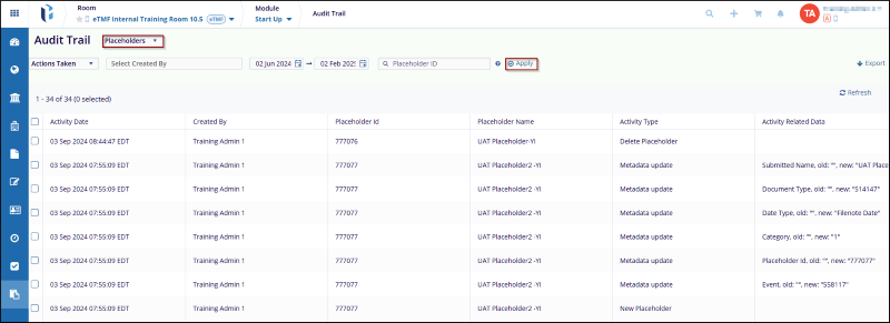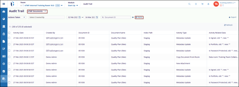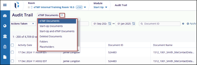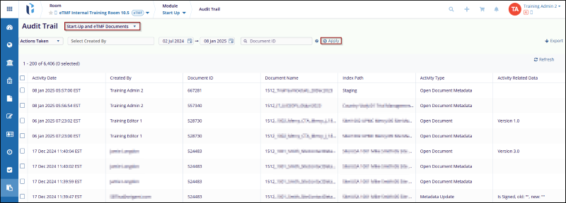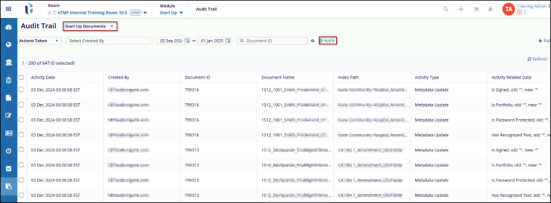 User Interface for Start-Up and eTMF documents: When the audit trail for Start-Up and eTMF Documents is retrieved, the data is presented in the following columns.