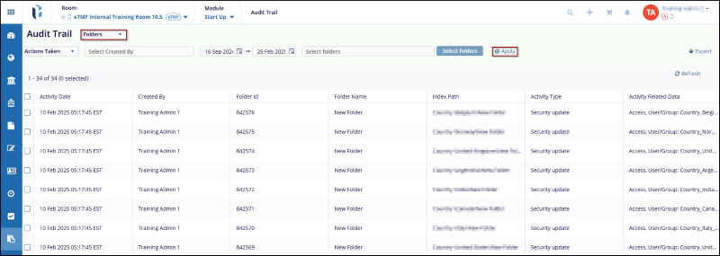 Folders: When the audit trail for Folders is retrieved, the data is presented in the following columns.