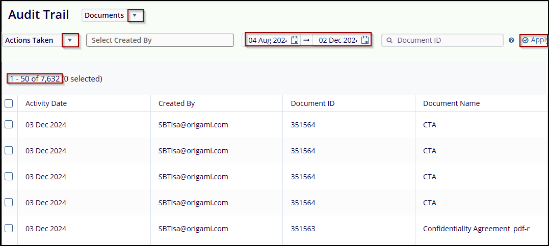 The Audit Trail in the Task module provides a comprehensive record of all actions performed on documents within a study room. This is designed to help users track activities for auditing and compliance purposes. Users can filter the audit trail by various criteria to efficiently retrieve specific records.