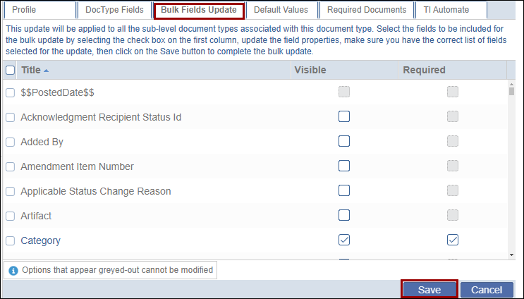 The Bulk Fields Update tab allows users to specifiy whether the field should be visible or required for all the sub-level document types associated with the parent document type. Refer to the instructions on bulk fields update detailed in the tab.