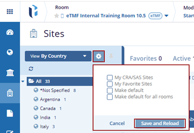 The data room supports hundreds of sites, allowing users to toggle between sites where they are a CRA, a Start-Up Specialist, or view all sites. Users can refresh the current view with the Refresh Current View button. Room administrators can configure the grid layout using the Configure Grid button to set default columns and sorting options. While all users can show or hide columns, only administrators can make additional columns available for viewing.