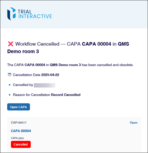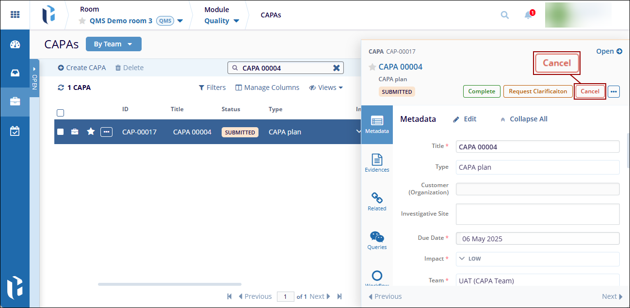 Authorities in the workflow stages can cancel a CAPA record depending on the configurations in the workflow stages. Once an authority cancels a CAPA, the record is removed from the workflow.