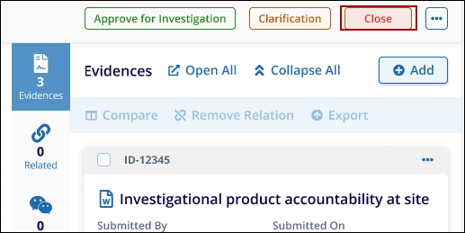 (Refer to Screenshot - The Close button appears along with other action options like Approve for Investigation and Clarification.)