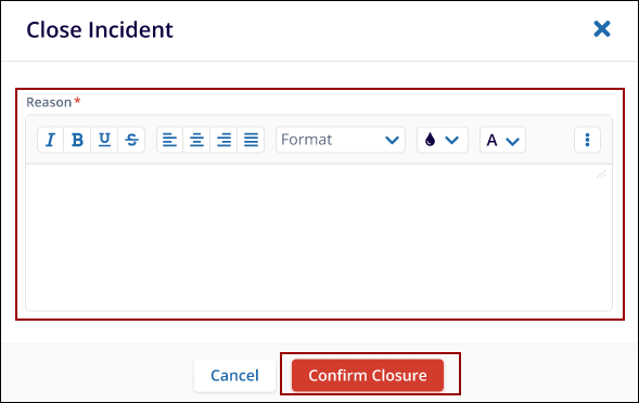 - Provide the reason for closing the incident and click on the confirm closure button to complete the cancellation.