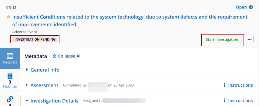 - Click the Start Investigation button located at the top-right corner of the