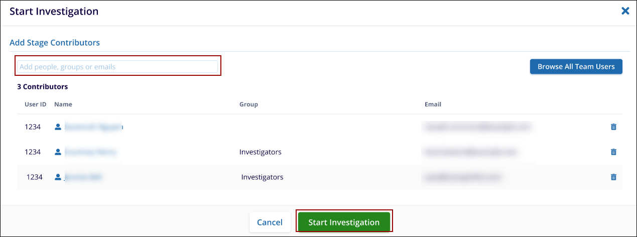 - In the Add Stage Contributors field, enter the name, group, or email address of the Sub-Investigator to add to the Investigation.
