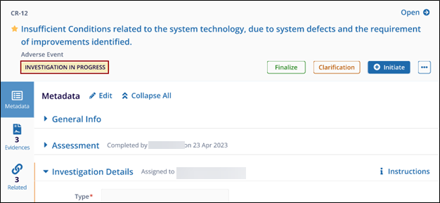 - Once the Incident is completed, investigate. The main investigator can finalize the incident.