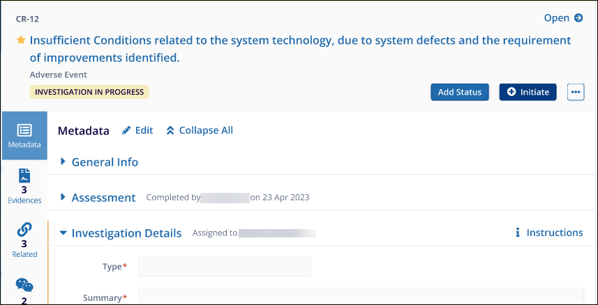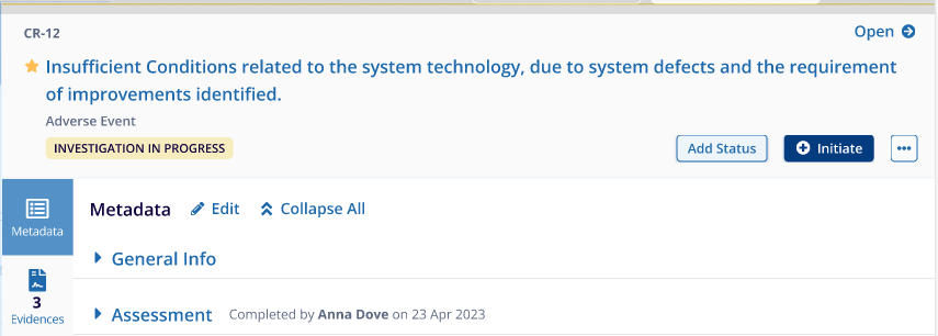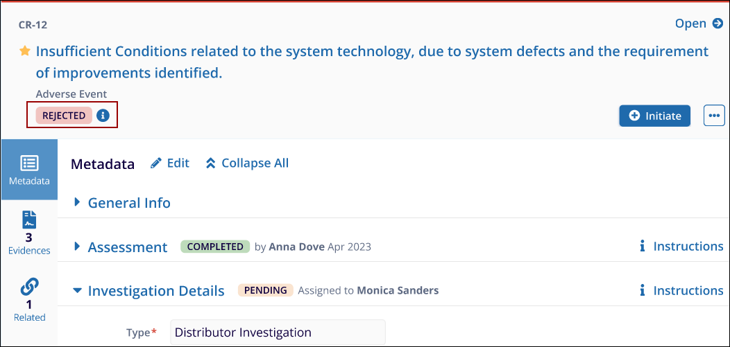 - The sub-investigator should click on the + Initiate button to create and CAPA