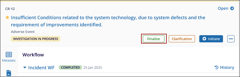 Incidents can be canceled at any stage, depending on the configuration of the workflow. Once an authority cancels a CAPA, the record is removed from the workflow.