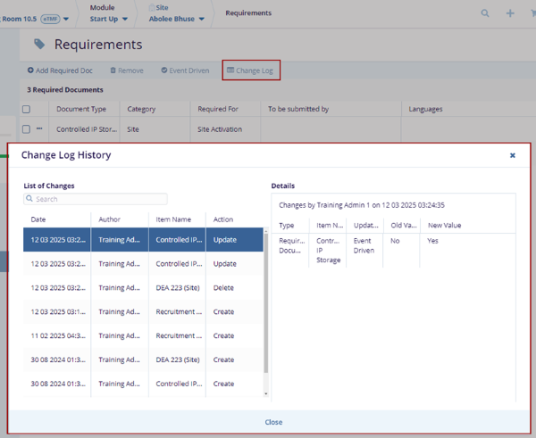 Change Log Click the Change Log button on the top menu bar. The Change Log History pop-up window is displayed with the list of changes and details.