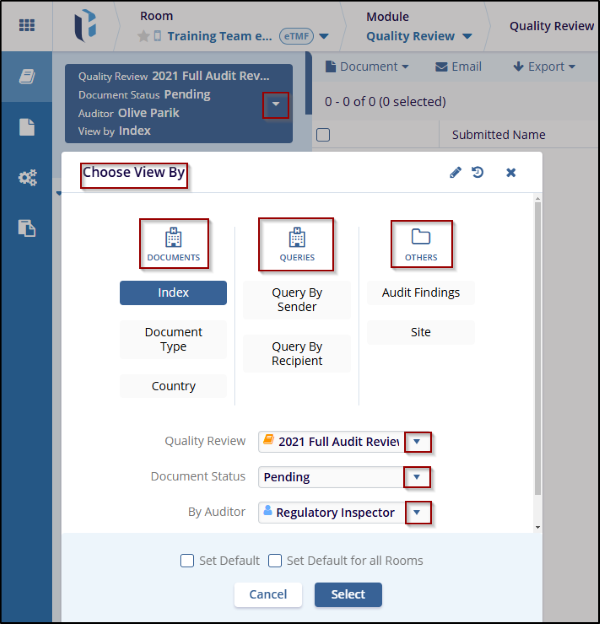 - Document Type: Provides the option to view documents by their type (e.g., Trial, Country, Sites, etc.).