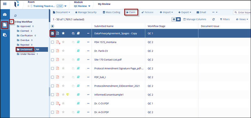 - Check the checkbox of the documents to be claimed, the user could claim one document at a time but selecting multiple documents is far more efficient.