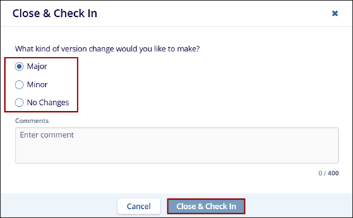 The metadata panel of a document in a collaborative session allows users to view and update the profile details, close the session, check back in the updated document, and access different versions of the document.