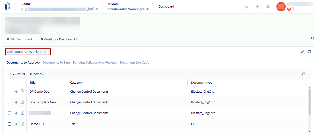 The Collaborative Workspace group of dashlets is exclusive to TI Collaborate rooms and includes dashlets that provide users the visibility and access to documents required to be approved and electronically Signed. Additionally, users get clarity on the pending collaborative reviews and the document life cycle.