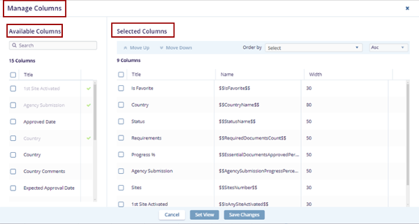 - On the Manage Columns window, the Available Columns section lists the column titles,