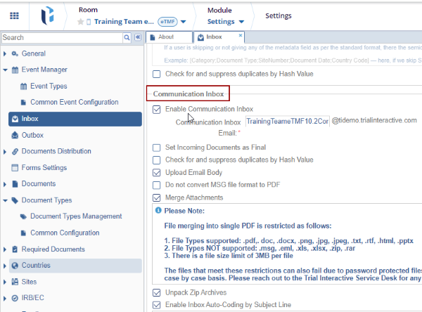 - Room administrators can enable the Communication Inbox by checking the checkbox, allowing room participants to receive the trial documents.