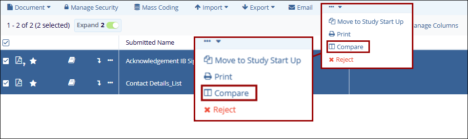 - The selected documents will appear side-by-side in a pop-out window along with any associated metadata.