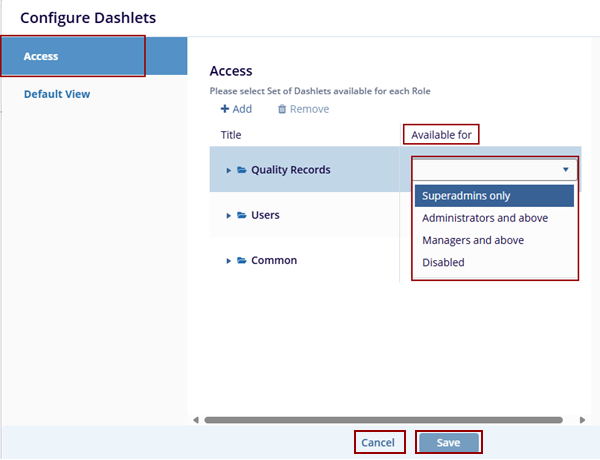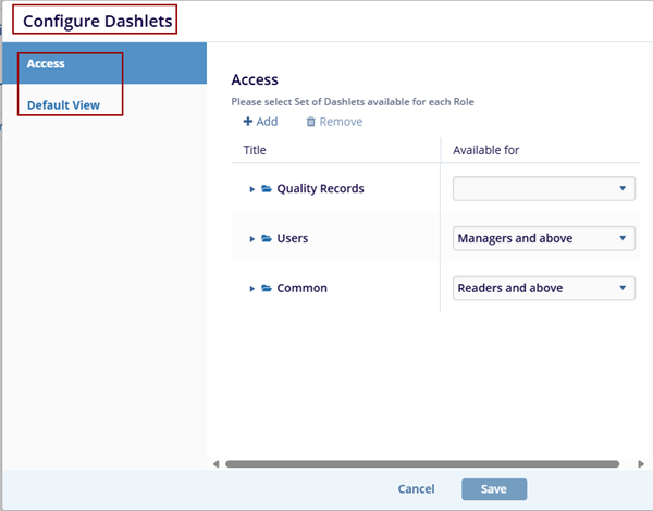 The Configure Dashlets allows administrators to manage the availability and visibility of dashlets on the dashboard for different user roles. Dashlets are individual components that display specific data or functionality, such as documents, users, or key metrics, making the dashboard customizable and role-specific.