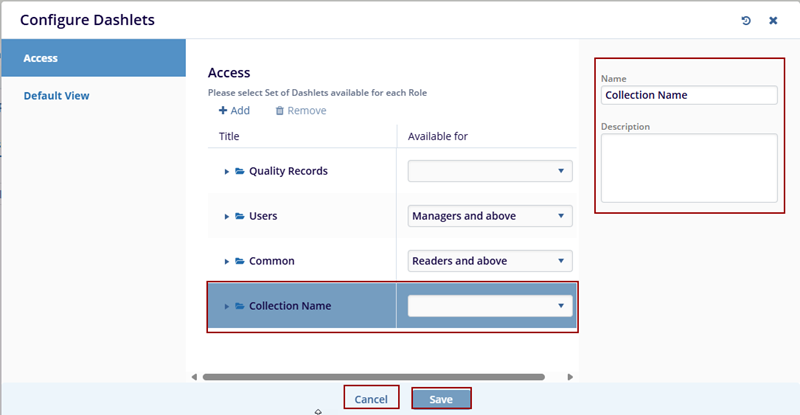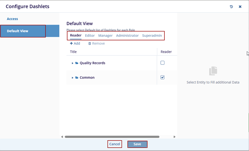 - Switch to the Default View tab, and select the required and appropriate checkboxes for the roles mentioned – Reader, Editor, Manager, and Administrator.