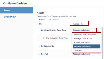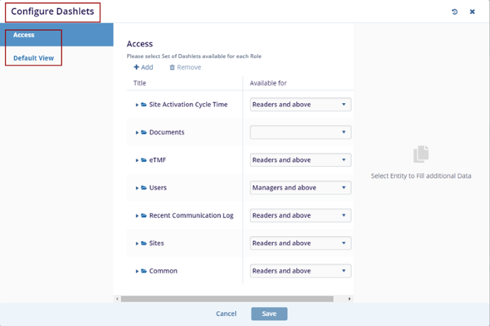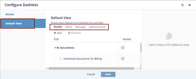 - Access: To select a Set of Dashlets available for each role.