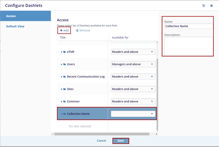 - Click Add, and a new entry appears in the title list as Collection Name. Enter the Title and Description in the left-side fields before adding the dashlet.