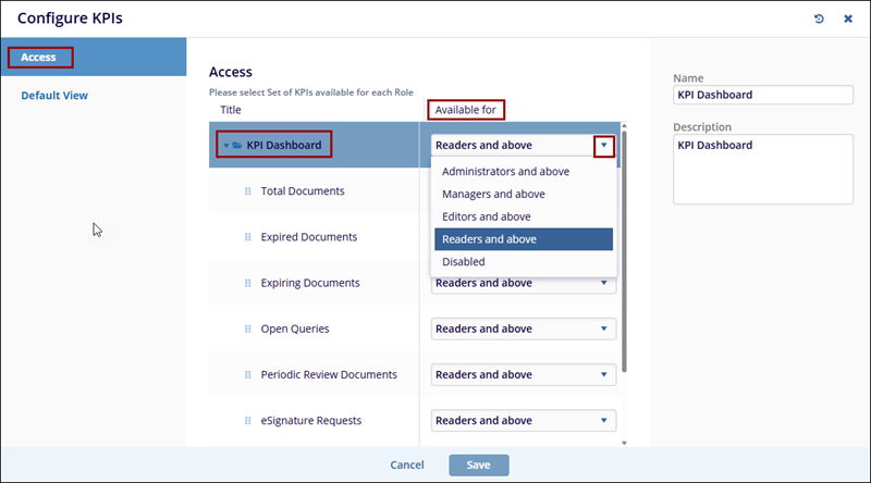 - On the Access tab, expand the KPI Dashboard fields using the arrow and select the