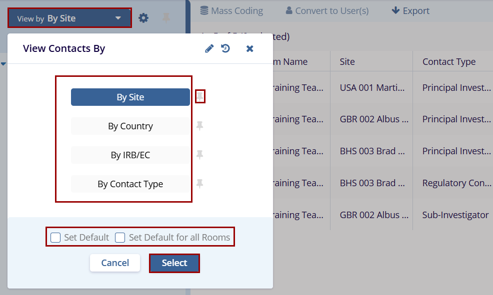 - By IRB/EC: Displays contacts grouped by the IRB/EC.