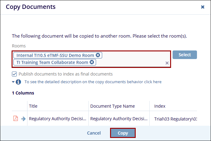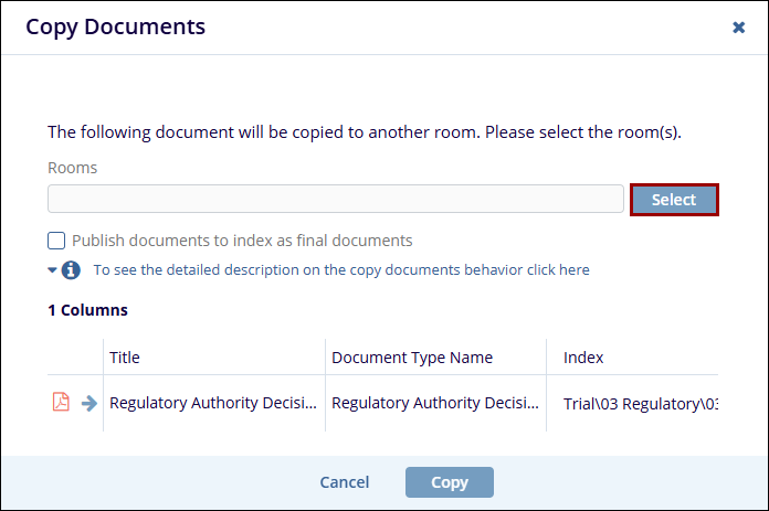 Trial Interactive allows Cross-Study Copy of Documents through this functionality. When users select the Copy to Other Rooms option from the Documents Cart, selected documents as well as their metadata will be copied to other rooms.