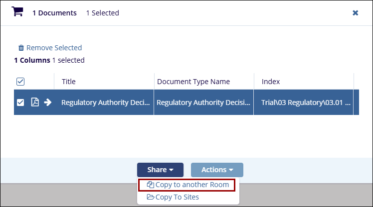 Trial Interactive allows Cross-Study Copy of Documents through this functionality. When users select the Copy to Other Rooms option from the Documents Cart, selected documents as well as their metadata will be copied to other rooms.
