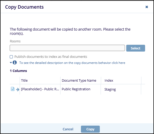 - Click Copy. The document type of the destination room will determine the