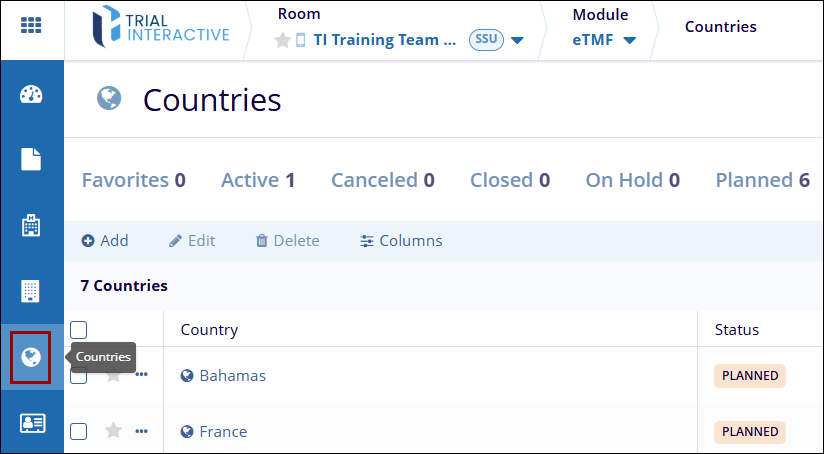 - From the left-hand navigation menu, select the Countries modal.